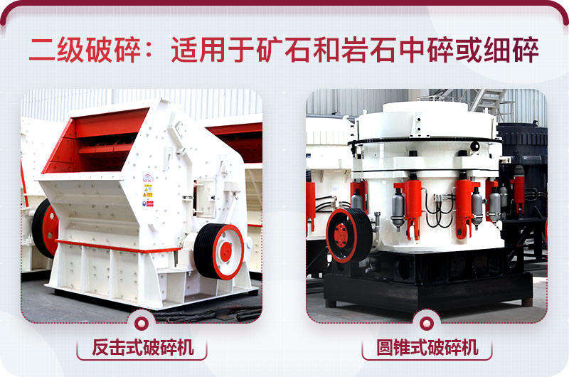 二破(圆锥破/反击破):二破用圆锥破或反击破都可以,只不过考虑到产量和成品粒型,前者更偏向于硬度较大的石料,后者适用于软性物料。
