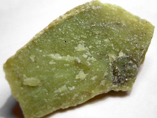 蛇纹石质玉石质地呈细腻的致密块体,质地细腻,用手触摸有滑感。它由细小纤维状、叶片状和胶状蛇纹石晶体组成,呈网斑状结构。有时在均匀分布的基底上,可见密集堆积的云朵状白色斑状。少数纤维状块体琢磨后有猫眼效应。