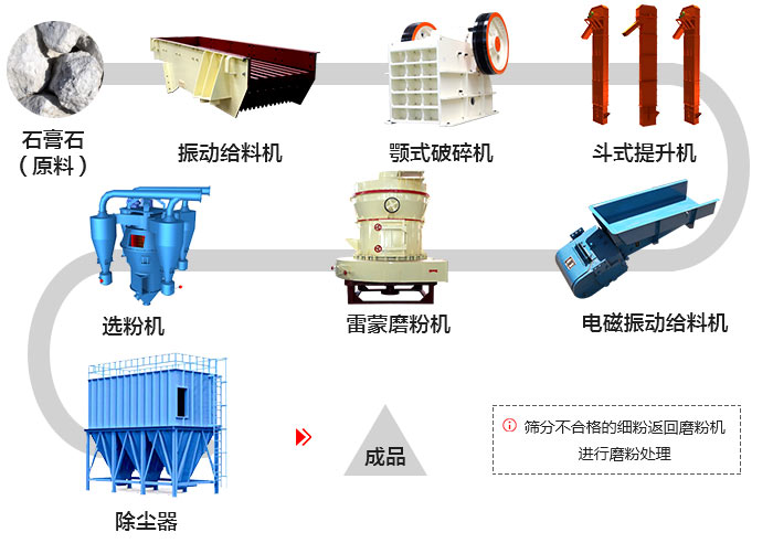 大块的石膏石原料在给料机的作用下,并均匀、连续的送入颚式破碎机进行粗碎加工,破碎后的石膏石在斗式提升机的作用下被送入料仓,之后由电磁振动给料机均匀、定量的送到雷蒙磨粉机进行磨粉加工,经磨粉后的粉末在鼓风机的租用下吹向分析机进行分选,分选后的物料由广岛输送到大旋风收粉器,后经出料口输出。