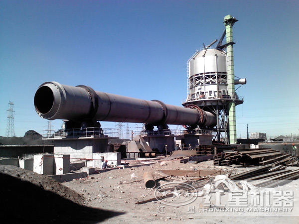 石灰石在预热器被1150摄氏度窑烟气加热到900摄氏度左右,约有30%分解,经液压推杆推入回转窑内,石灰石在回转窑内经焙烧分解为CaO和CO2。分解后生成石灰进入冷却器,在冷却器内被鼓入的冷空气冷却到100摄氏度以下排出。经热交换的600摄氏度热空气进入窑与煤气混合燃料。废气再兑入冷风经引风机进入袋式除尘器,再经排风机排入烟囱。排出冷却器的石灰经振动给料机、链斗运输机、斗式提升机、胶带输送机送入石灰贮库,根据用户需要确定是否进行筛分等工序。