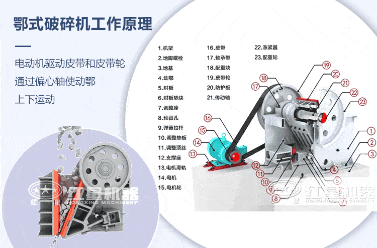 电动机驱动皮带和皮带轮,通过偏心轴使动鄂上下运动,当动鄂上升时肘板与动鄂间夹角变大,从而推动动鄂板向固定鄂板接近,与其同时物料被压碎或劈碎,达到破碎的目的;当动鄂下行时,肘板与动鄂夹角变小,动鄂板在拉杆弹簧的作用下,离开固定鄂板,此时已破碎物料从破碎腔下口排出。随着电动机连续转动而破碎机动鄂作周期运动压碎和排泄物料,实现鄂式破碎机的批量生产。