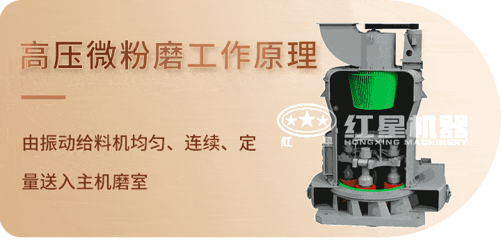 高压微粉磨主要由主机,鼓风机,超细度分析机,成品旋风积粉器,布袋除尘器及连接风管管道等组成,在高压微粉磨(高压磨粉机)研磨室内,磨辊总成通过横担轴悬挂在磨辊吊架上,磨辊吊架与主轴及铲刀架固定联结,压力弹簧靠拉力杆紧紧的压在磨辊轴承室的悬臂外端上,以横担轴为支撑点,靠弹簧压力使磨辊紧紧压在磨环内圆表面上,当电机通过传动装置转动时,装在铲刀架上的铲刀与磨辊同步转动,磨辊在磨环内圆表面上滚动的同时绕自身转动,分析机通过电机传动装置带动分析机叶轮旋转,其分析机的速度调整决定出粉细度。